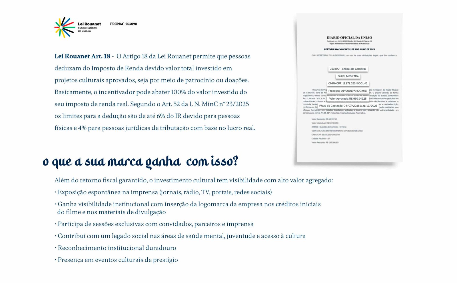 Projetos aprovados no Artigo 18 da Lei Rouanet podem ser patrocinados com 100% de isenção fiscal, tanto por pessoa jurídica quanto física.